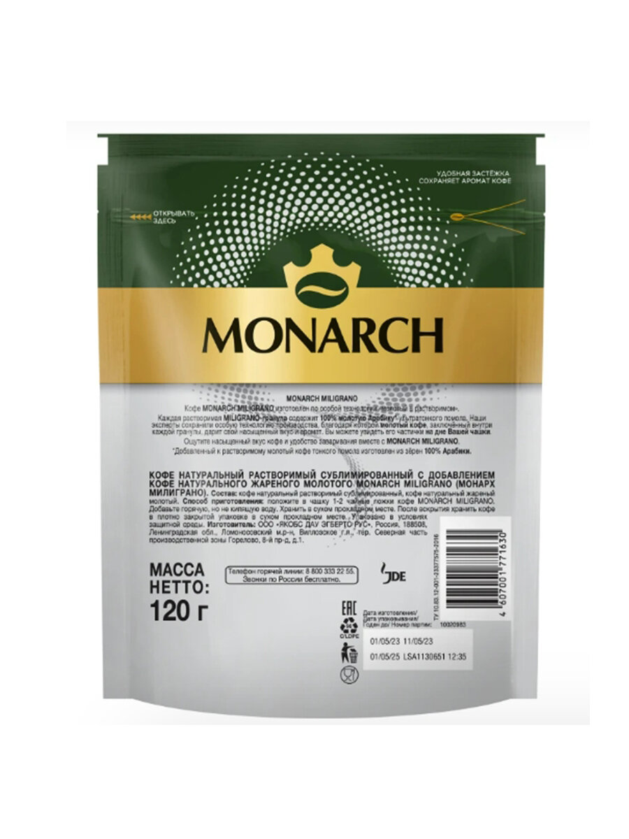 Кофе молотый в растворимом MONARCH "Miligrano" 120 г, сублимированный, ш/к 71630