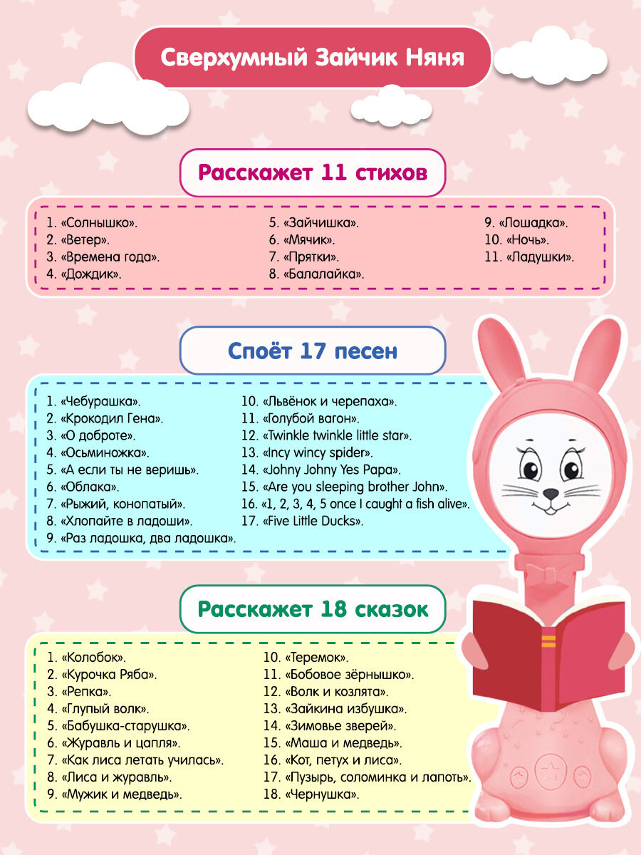 | Отзыв: | Если у вас в приоритете разнообразие обучающих программ берите этого зайку. Это почти аналог зайки Алило,но без функции света. |