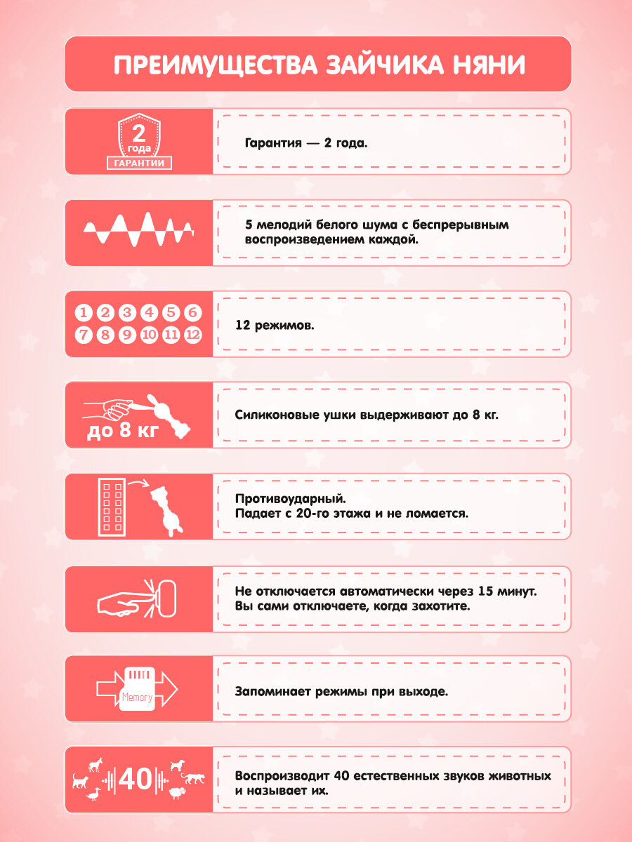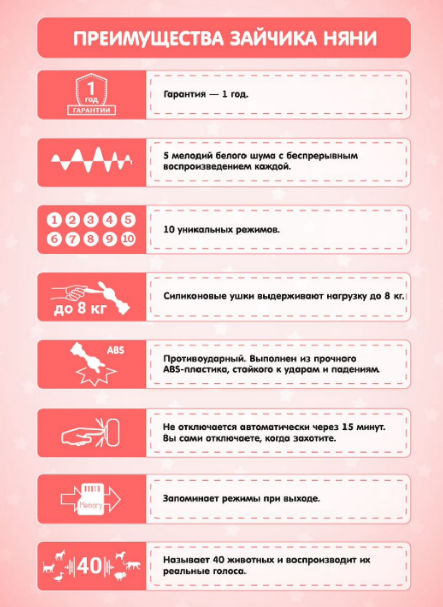 | Отзыв: | Увидела зайчика няню в соцсети instagram и решила заказать своему новорождённому ребёнку. Так как мы очень музыкальных, то это было моим спасением. У зайчика тираний 10 режимов: белый шум, погремушка, колыбельная, детские песни. Малышу очень нравится грызть резиновые ушки, дёсенки точит))) |