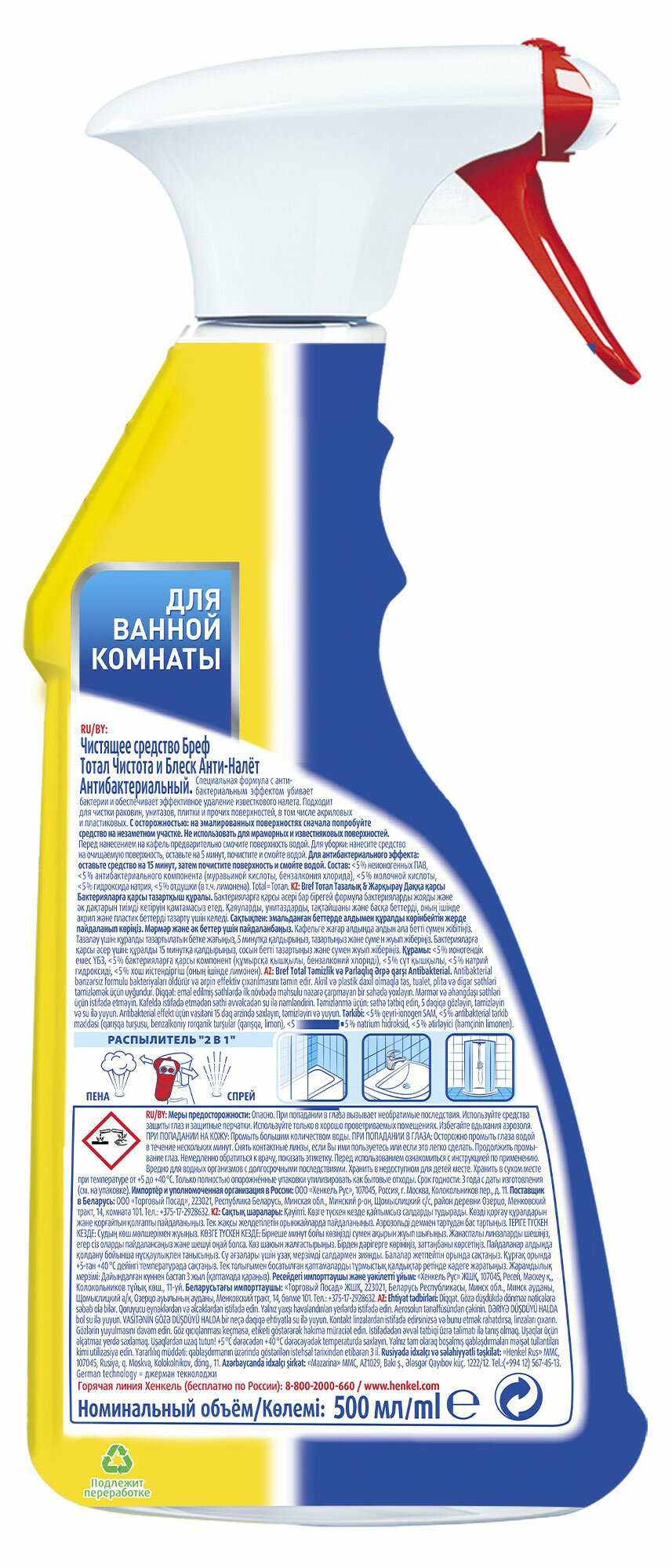 Бреф / Bref Total - Спрей универсальный Анти-налет Чистота и Блеск Лимонная свежесть 500 мл