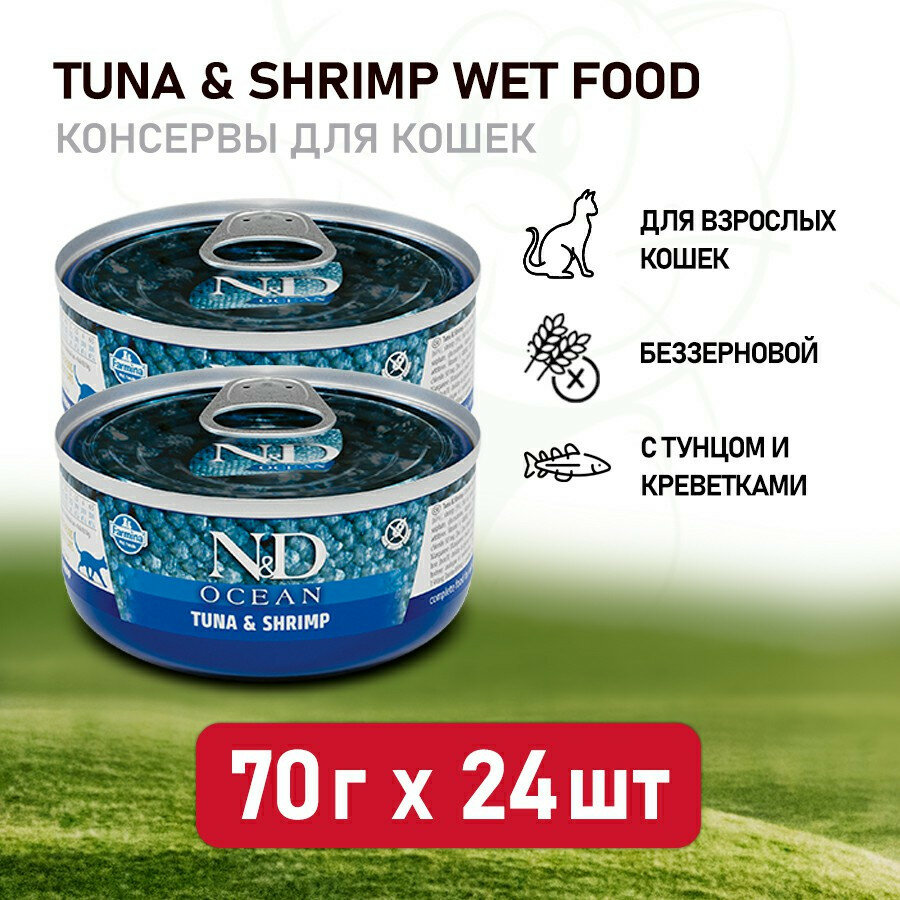 Влажный корм для кошек Farmina N&D Ocean, беззерновой, с тунцом, с креветками 24 шт. х 70 г