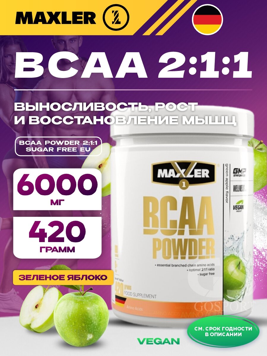 Купить БЦАА в порошке Maxler BCAA Powder 2:1:1 без сахара 420 г Зелёное яблоко