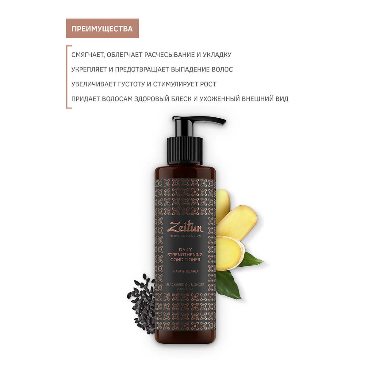 Бальзам-кондиционер ZEITUN для волос и бороды укрепляющий для мужчинС имбирем и черным тмином250мл 4660048351173