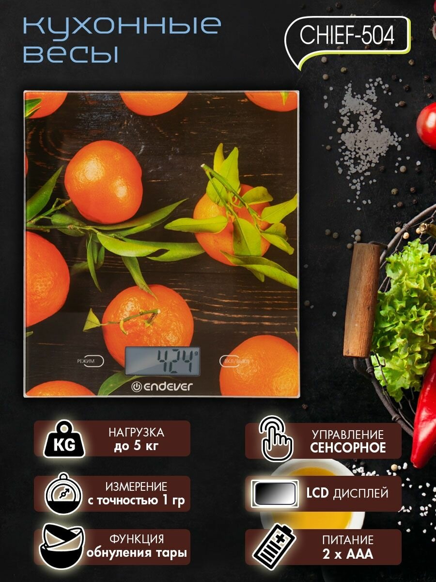Весы кухонные электронные Endever Chief-504, рисунок апельсины, от 2г до 5кг, тарокомпенсация, батарейки в комплекте