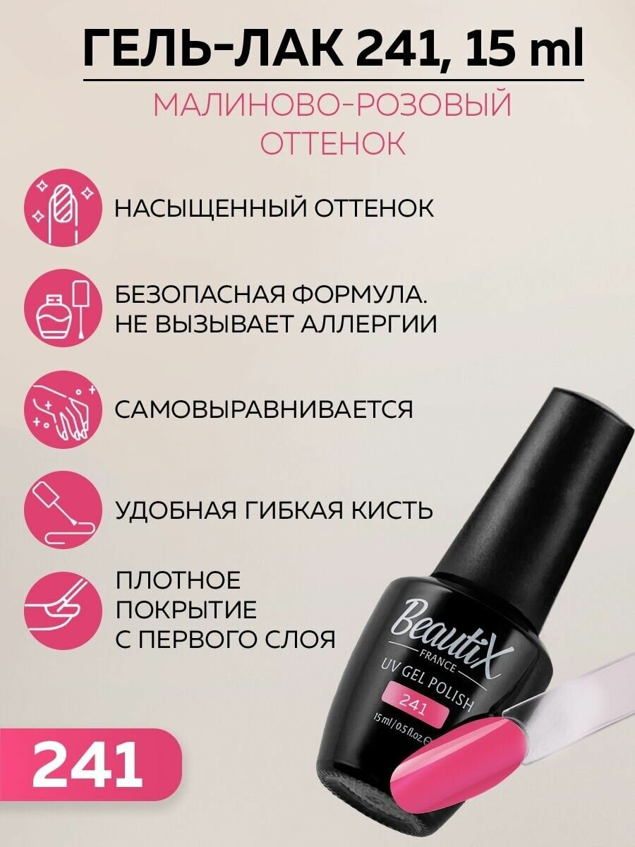 Beautix, Гель-лак 241, 15 мл (малиново-розовый, без перламутра и блесток, плотный)
