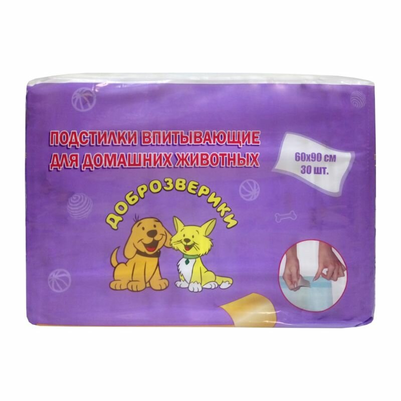 Пеленки одноразовые Доброзверики с липким фиксирующим слоем 60х90, 30 шт.