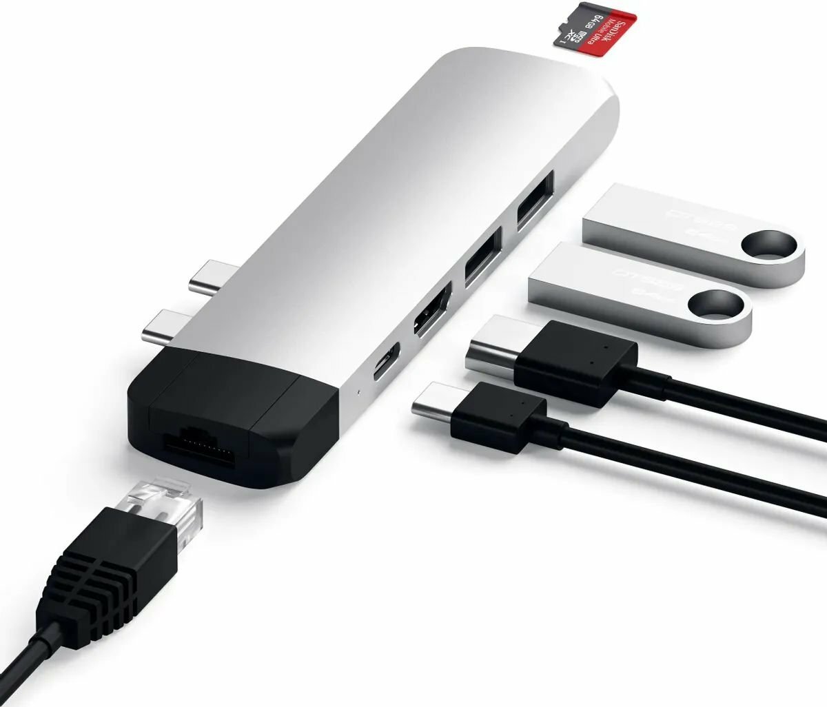 USB-хаб Satechi Aluminum Pro Hub with Ethernet & 4K HDMI для MacBook Air (2018-2020), MacBook Pro (2018-2020). Цвет серебряный.