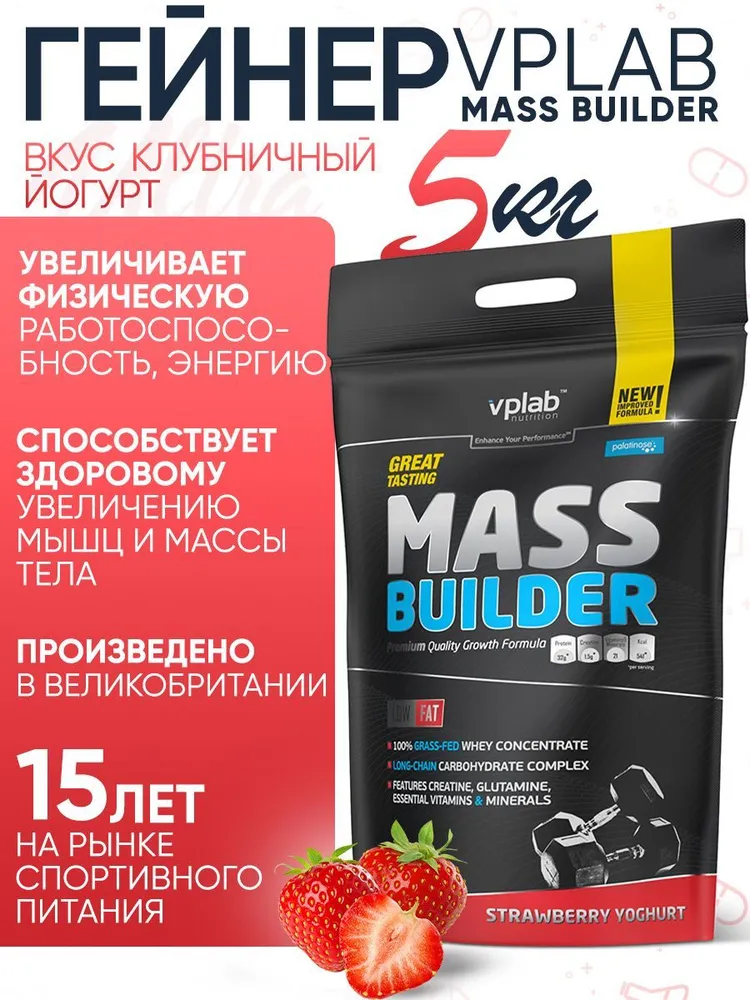 VPLab Nutrition Гейнер Mass Builder, вкус «Клубника и йогурт», 1,2 кг, VPLab