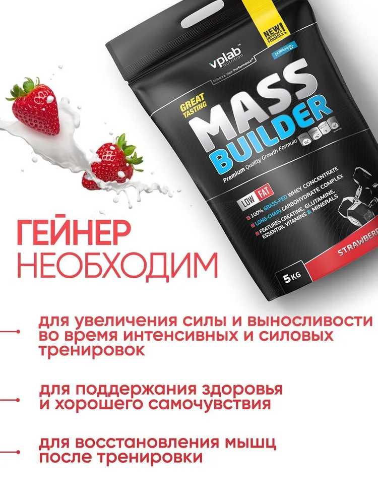 СохранитьГейнер для набора массы, протеин сывороточный, bcaa порошок, спортивное питание для мужчин и женщин, Vplab Mass Builder, клубничный йогурт, 5кг интересное: