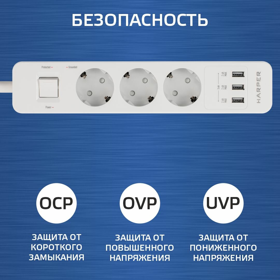 Сетевой фильтр Harper UCH-330 white (3 розетки, 3 USB-порта,1,5 метра, шторки, встроенная защита от скачков напряжения и тока)