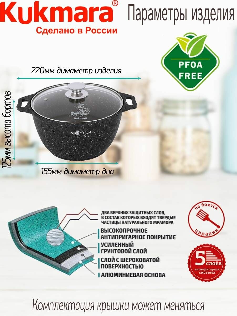 Кастрюля Kukmara 3 л индукция, покрытие Мрамор темный, литой алюминий, со стеклянной крышкой 22см, кмти32а
