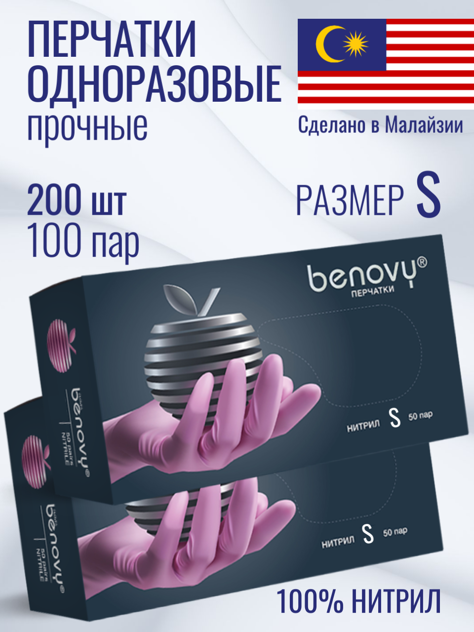 Перчатки нитриловые белые BENOVY размер S, 50 пар/упк