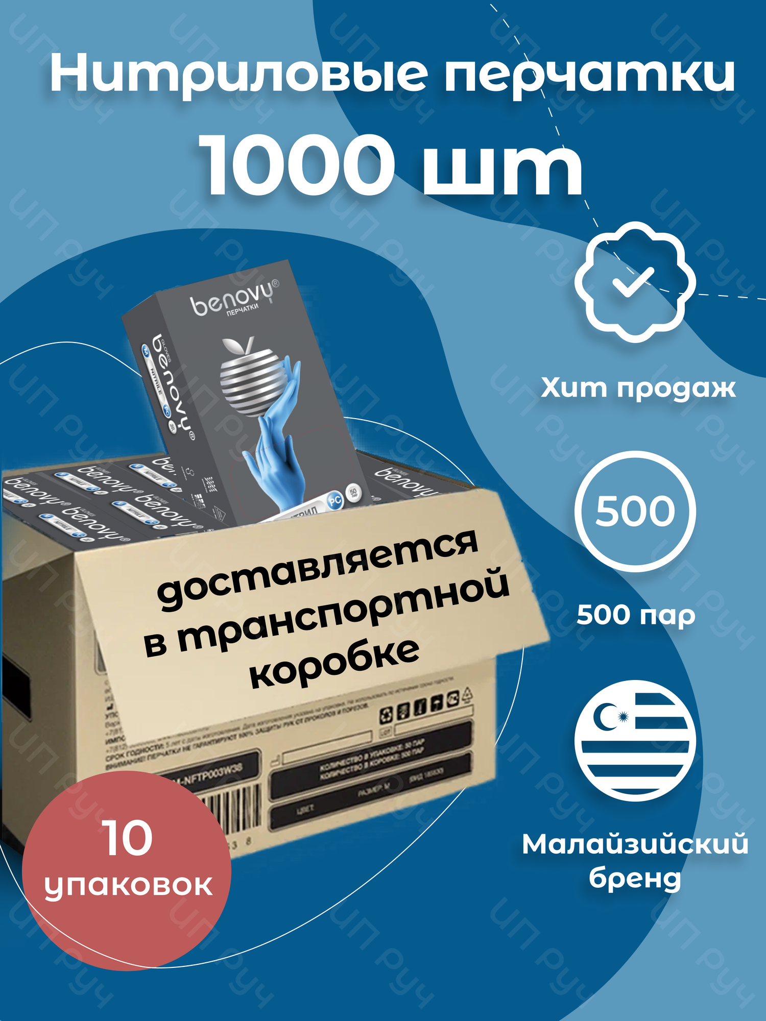 Купить Перчатки нитриловые одноразовые Benovy 1000 шт. (500 пар), размер M, 10 упаковок