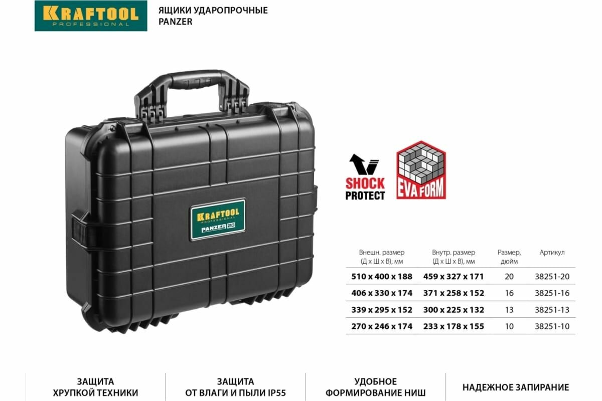 KRAFTOOL PANZER-20, 510 х 400 х 190 мм, (20"), IP55, ударопрочный пластиковый ящик (38251-20)