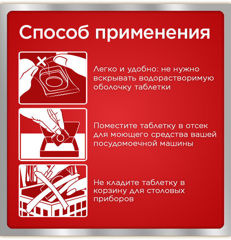 | Плюсы: | Хорошо отмывает посуду, таблетки удобные в использовании, не надо снимать плёнку. |