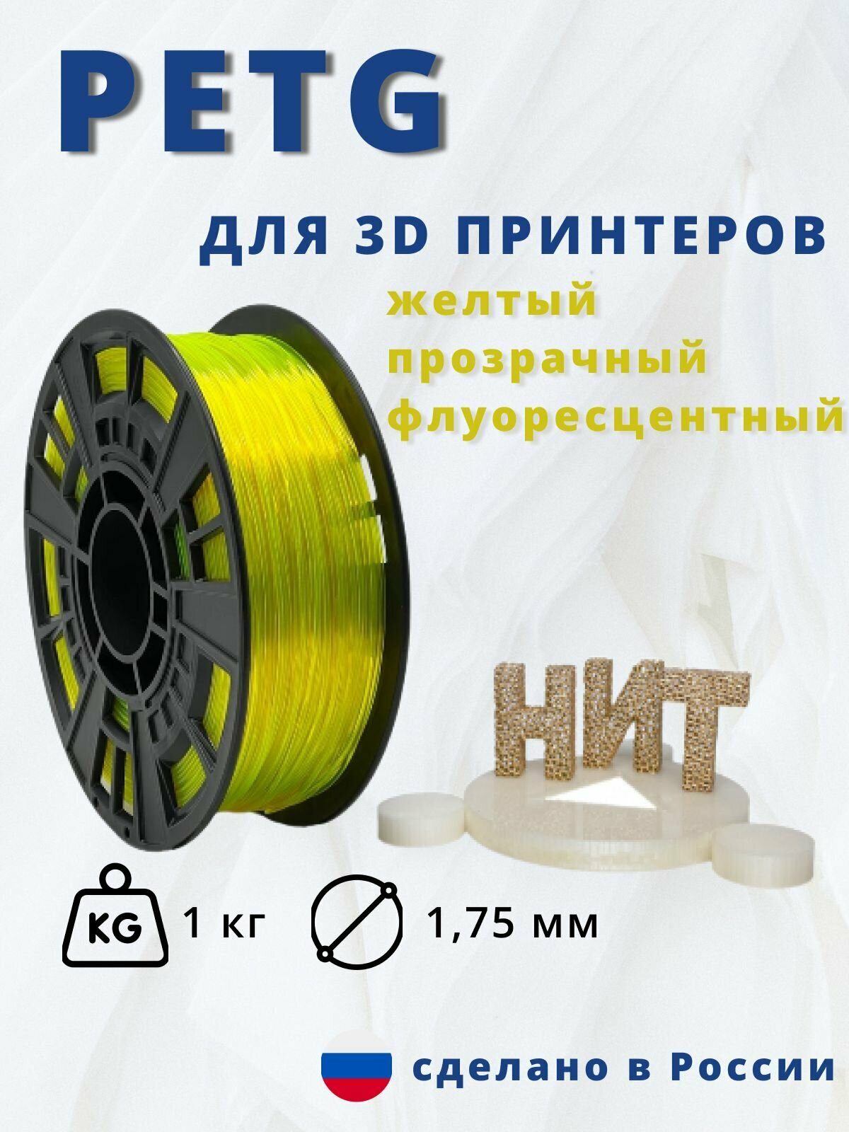Купить Пластик для 3D печати "НИТ", Petg желтый прозрачный флуоресцентный 1 кг.
