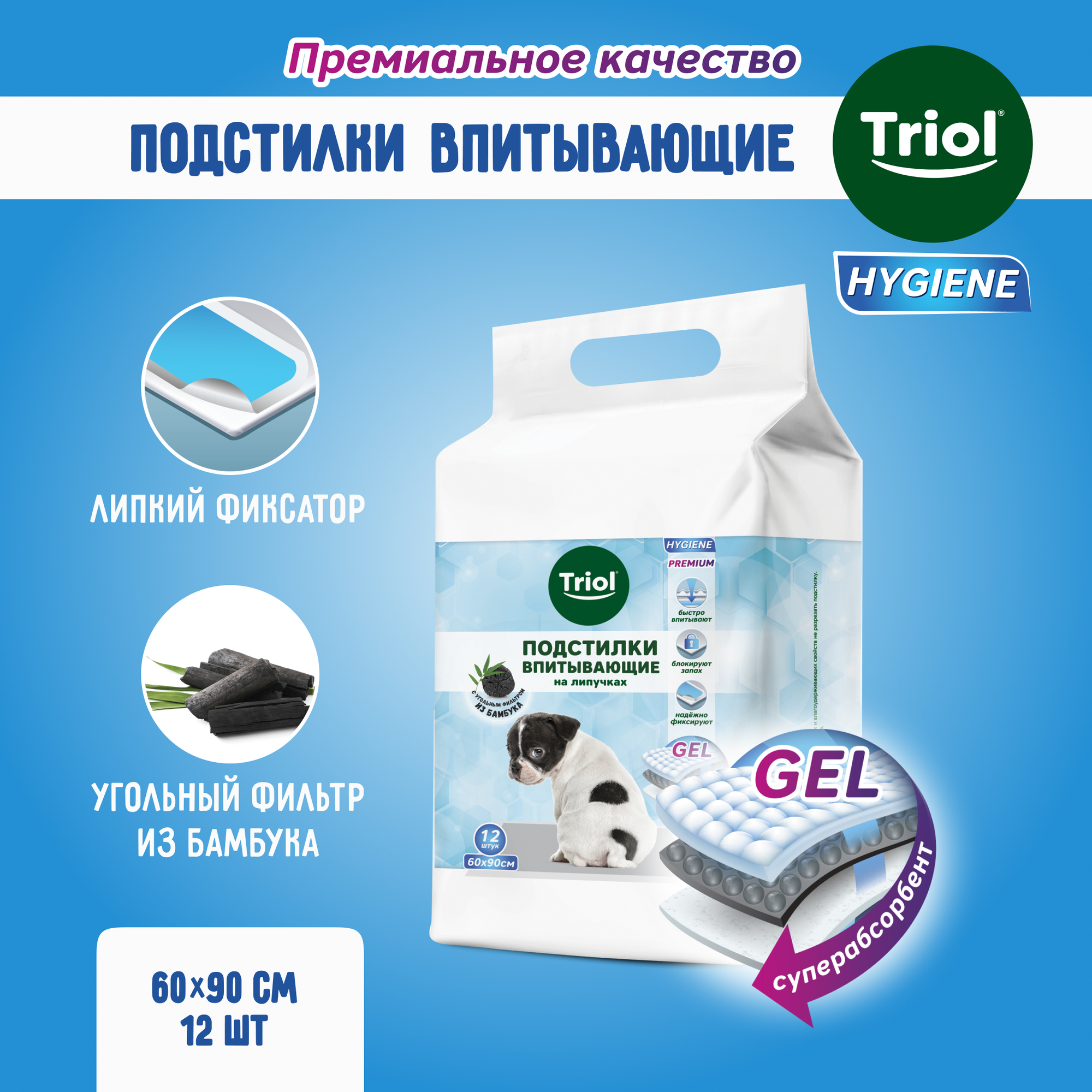 Triol подстилки впитывающие с угольным фильтром на липучках, 600х900 мм, упаковка 12 шт