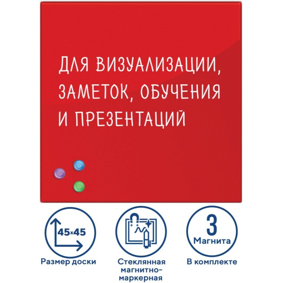 Доска магнитно-маркерная стеклянная (45×45 см), 3 магнита, красная, BRAUBERG