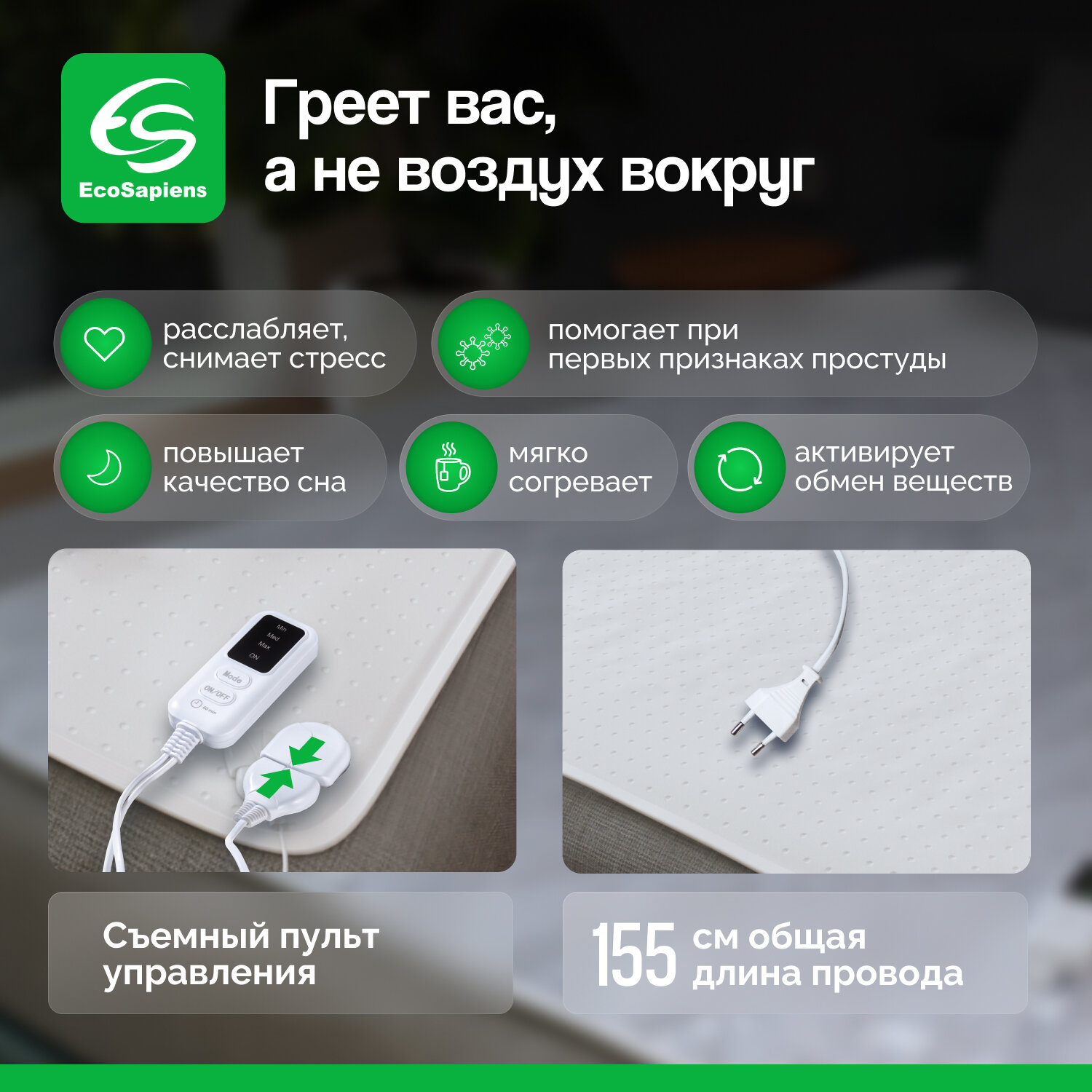 Электропростыня EcoSapiens Согревай-ка, электрическая простынь с подогревом, 3 программы до 8 часов работы, автоотключение, 150х90 см