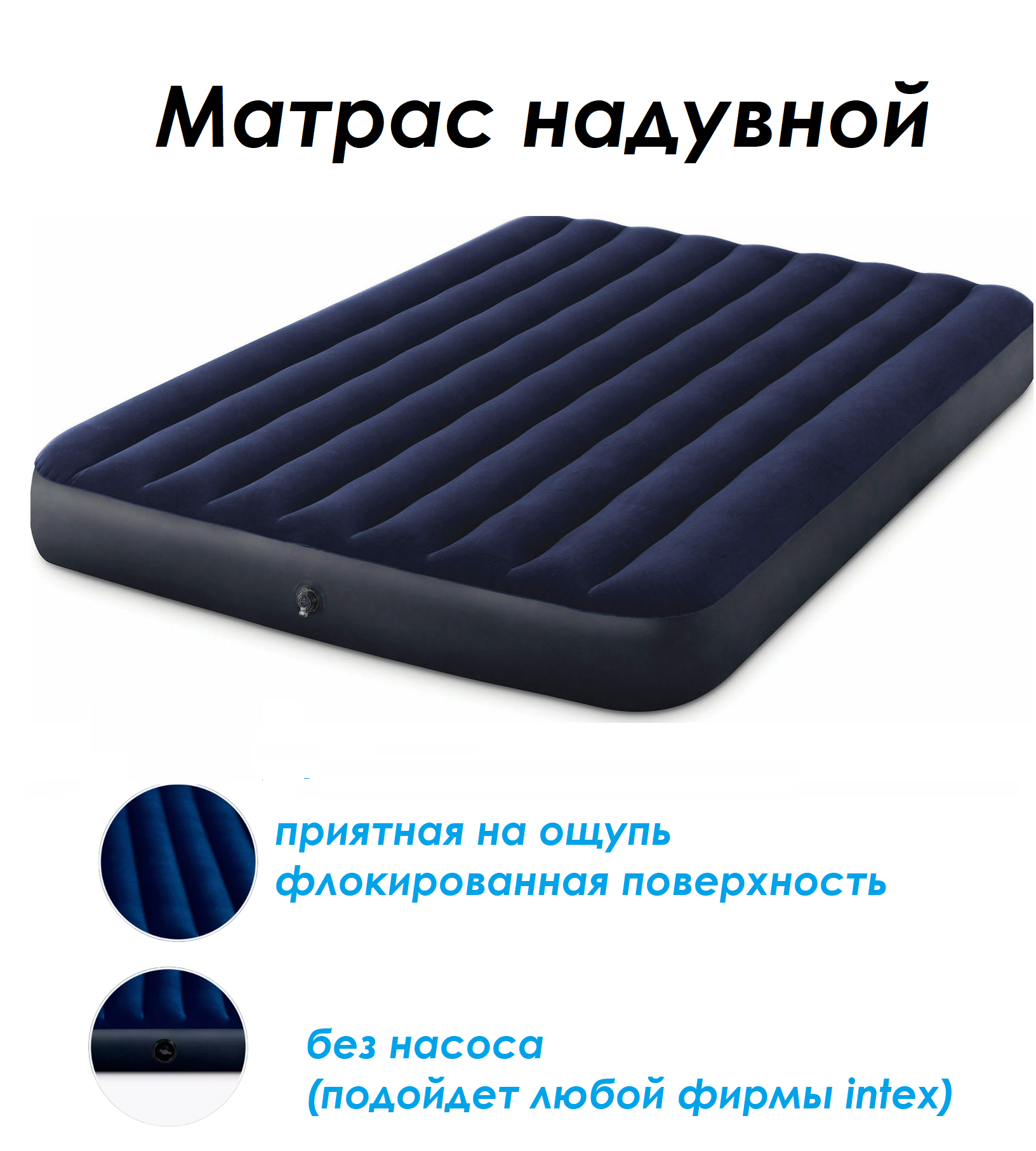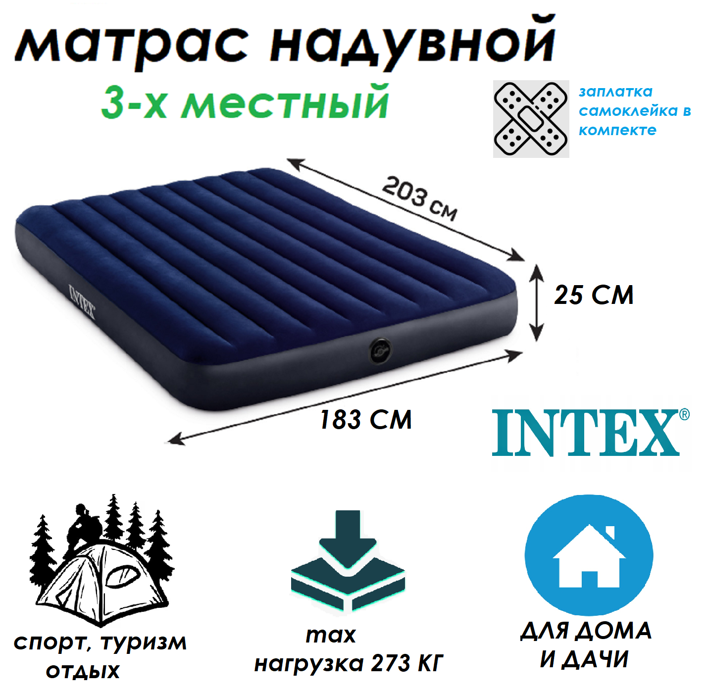 Матрас надувной Intex, 203х183х25 см, 64755, флокированный, 273 кг