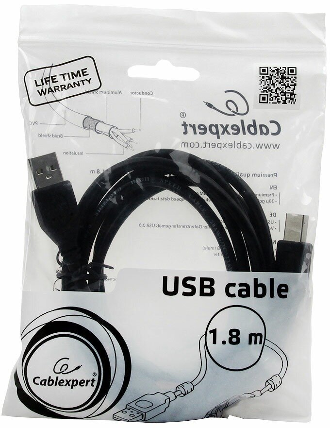 Кабель CABLEXPERT USB 2.0 Pro , AM/BM, 1.8м, экран, 2 феррит. кольца, черный, пакет