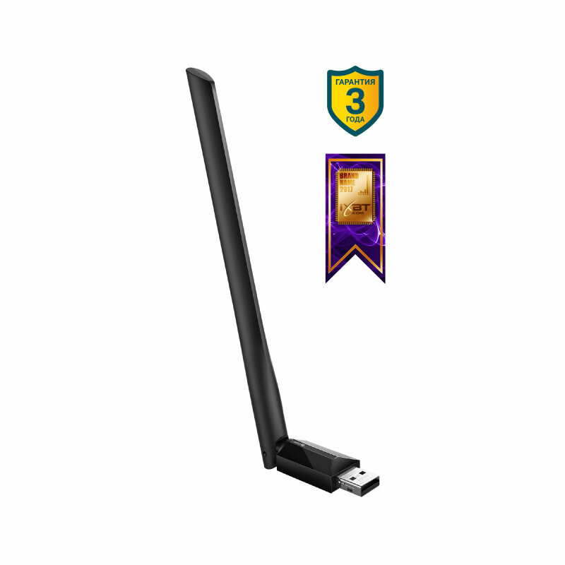 | Плюсы: | Недорого, поддержка более скоростного 5ГГц, более уверенный сигнал за счёт антенны по сравнению с миниатюрной версией адаптера. |