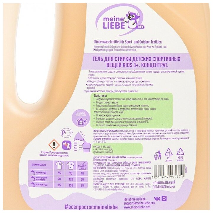 MEINE LIEBE Гель для стирки спортивных вещей KIDS 3+, концентрат, 800 мл