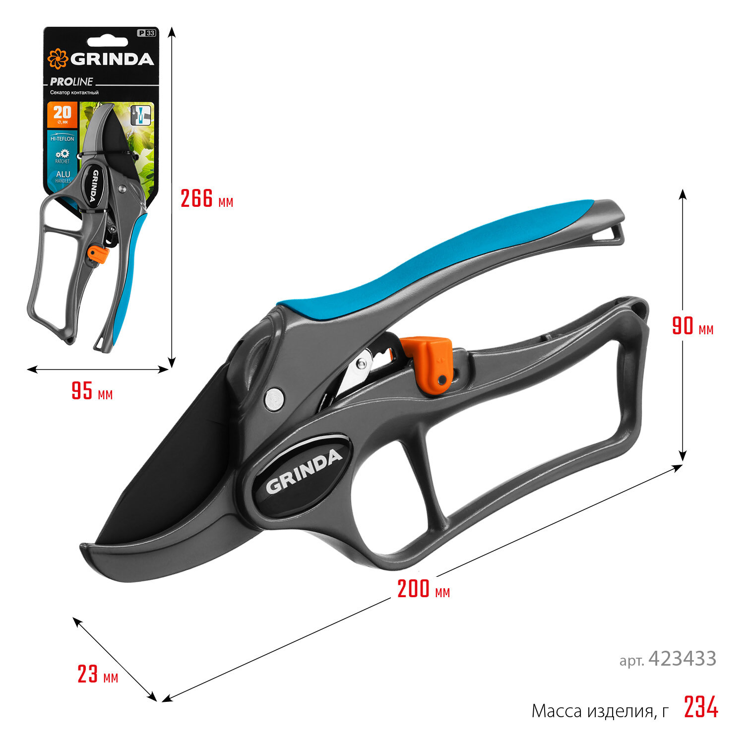 Контактный секатор с храповым механизмом с тефлоновым покрытием лезвия с алюминиевыми рукоятками с эфесом 200 мм GRINDA PROLine P-33 ( 423433 )