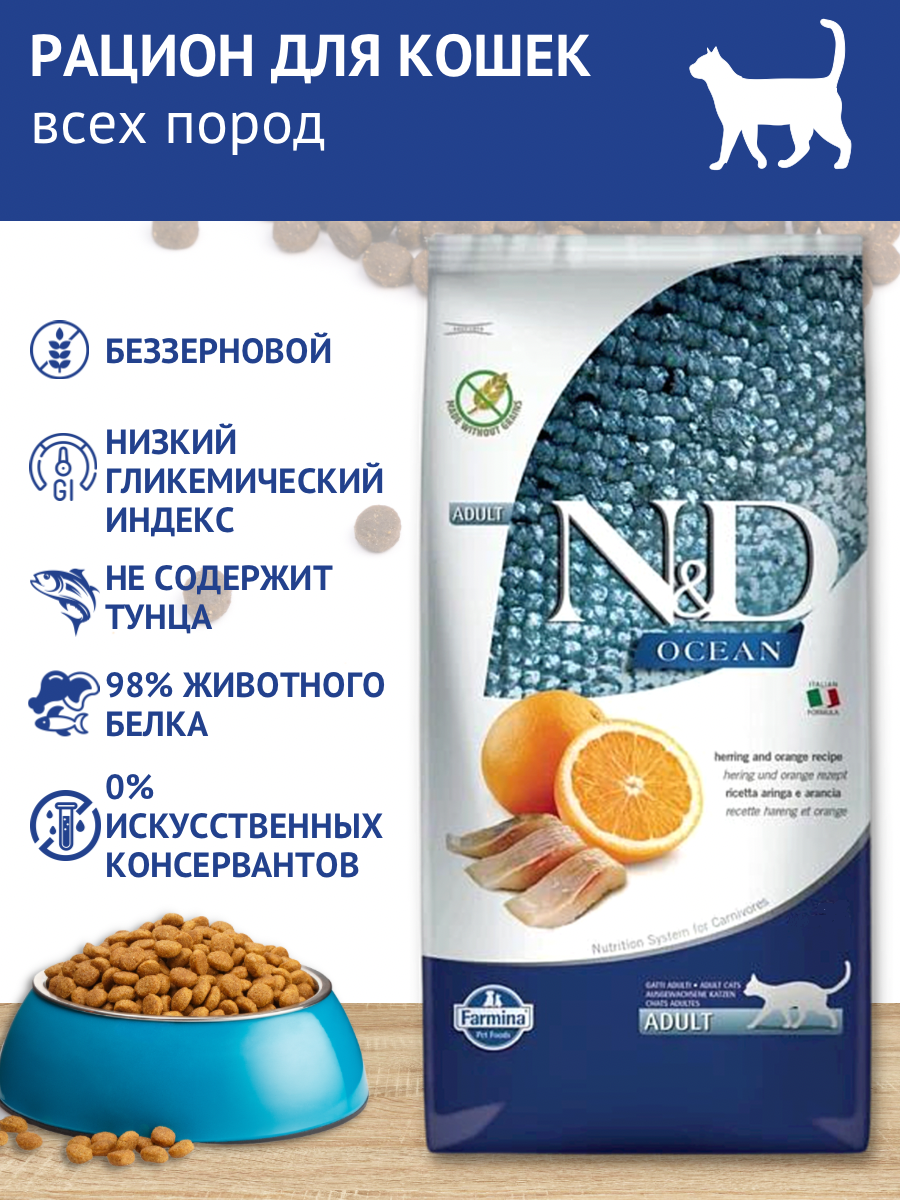Сухой корм Фармина N&D Ocean для взрослых кошек с сельдью и апельсином, беззерновой, 1,5 кг