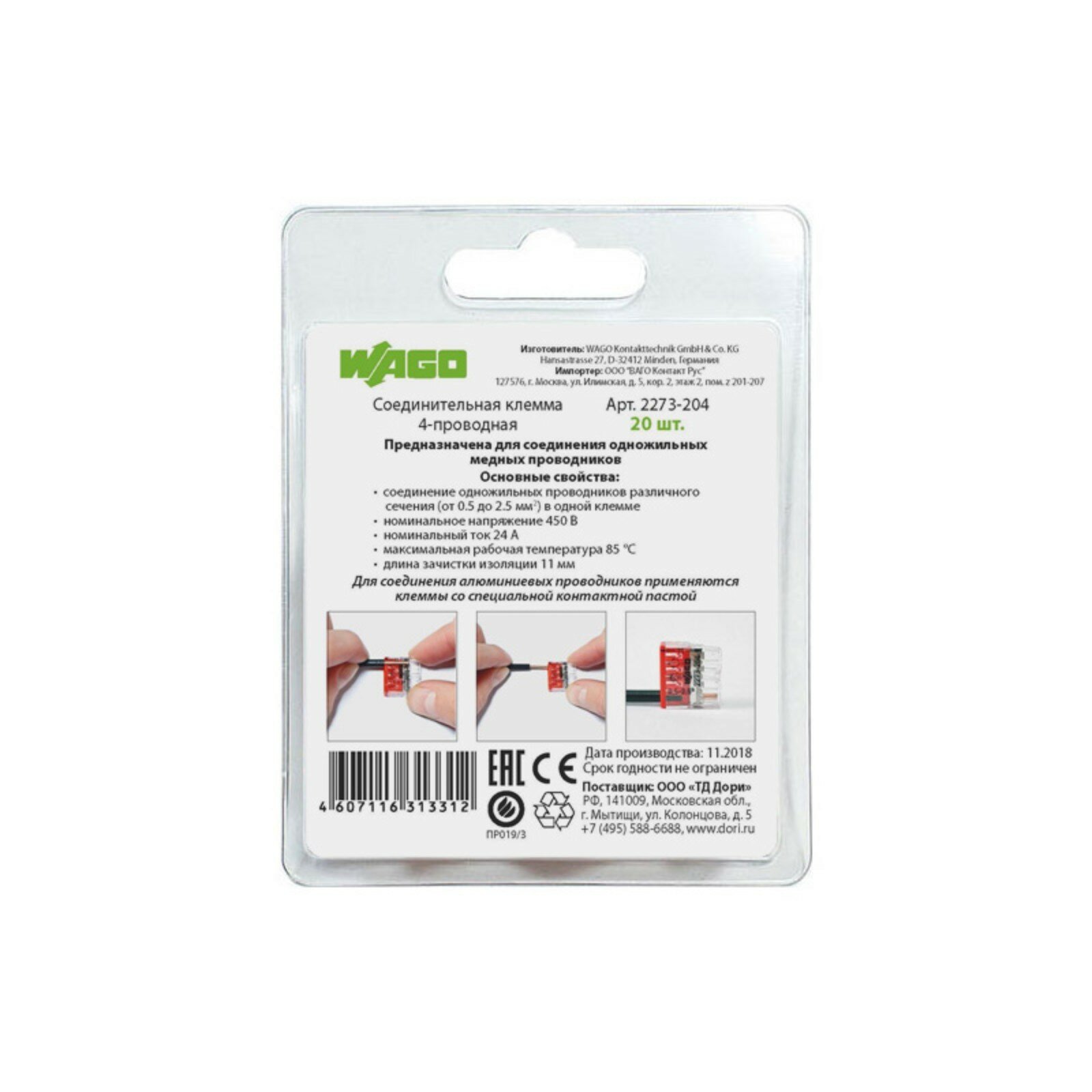 WAGO Соединительная клемма WAGO 4-х проводная (2273-204) 6 шт. в блистере