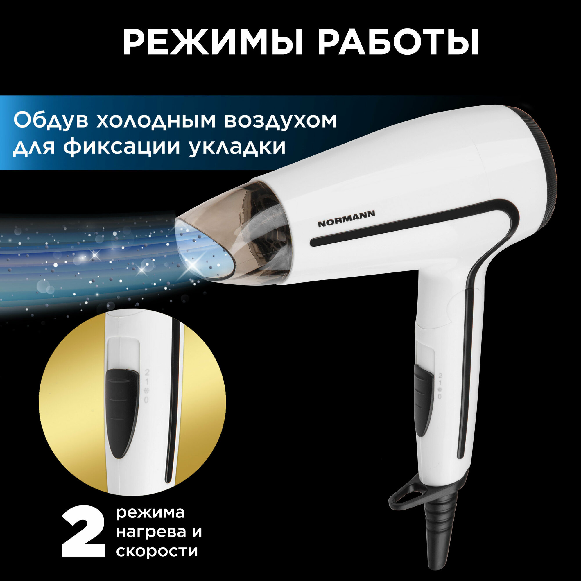 Фен NORMANN AHD-422 (1500 Вт; 2 режима; холод.обд.; складная ручка) (AHD-422)