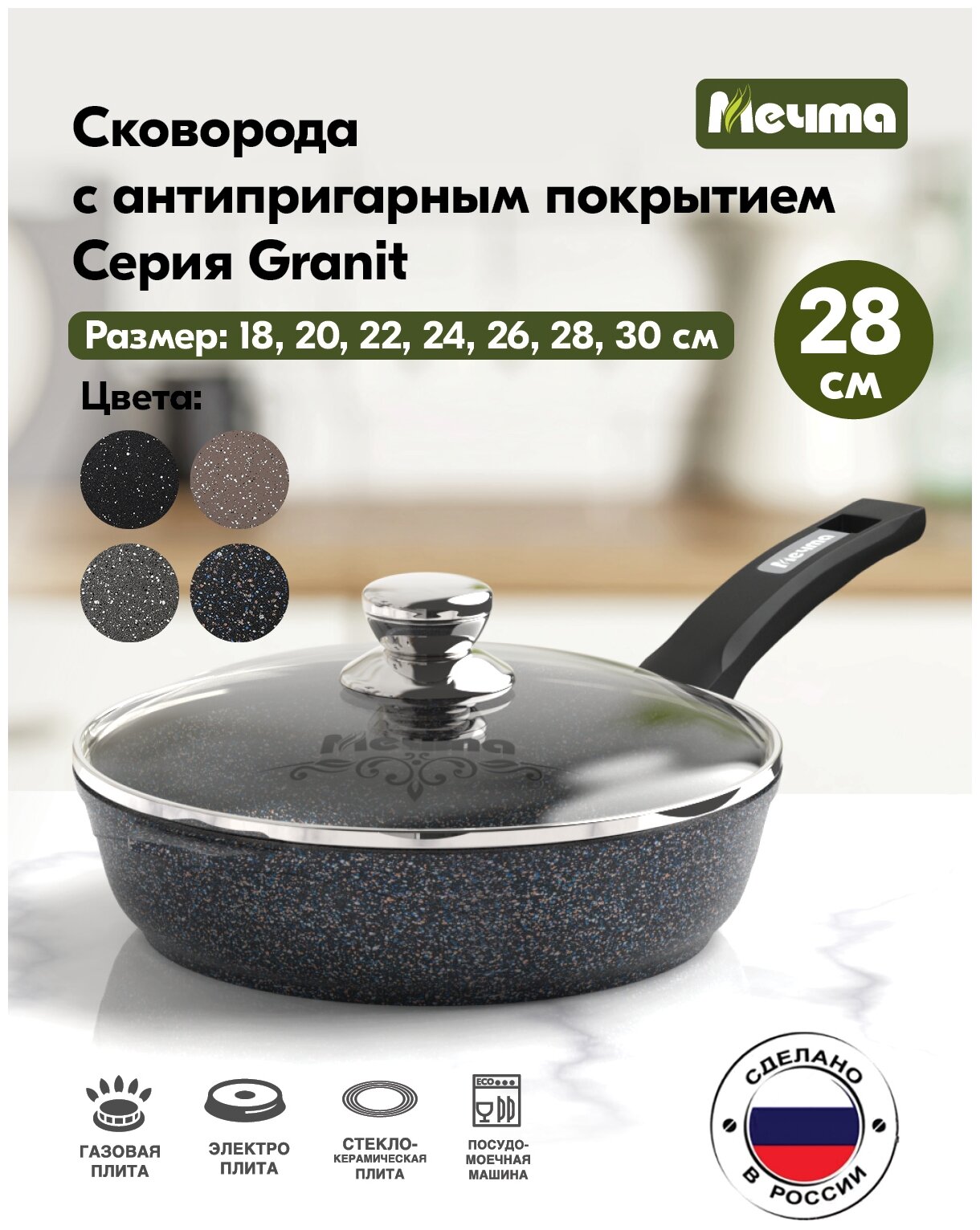 Сковорода Мечта 28 см Гранит с антипригарным покрытием с несъемной ручкой и крышкой, НЕ индукционная