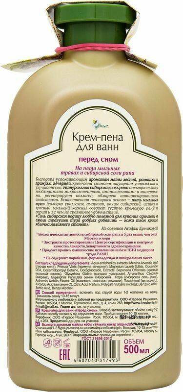 Пена для ванн РБАгафьи 500мл крем Перед сном