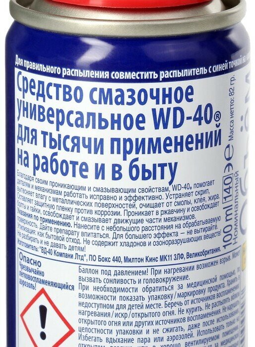 Ниже Вы можете прочитать отзывы на Смазка WD40 универсальная 100 мл WD-40 WD0000, ознакомится с подробными характеристиками, посмотреть интересные обзоры и фотографии на Смазка WD40 универсальная 100 мл WD-40 WD0000.