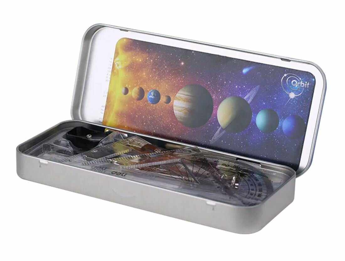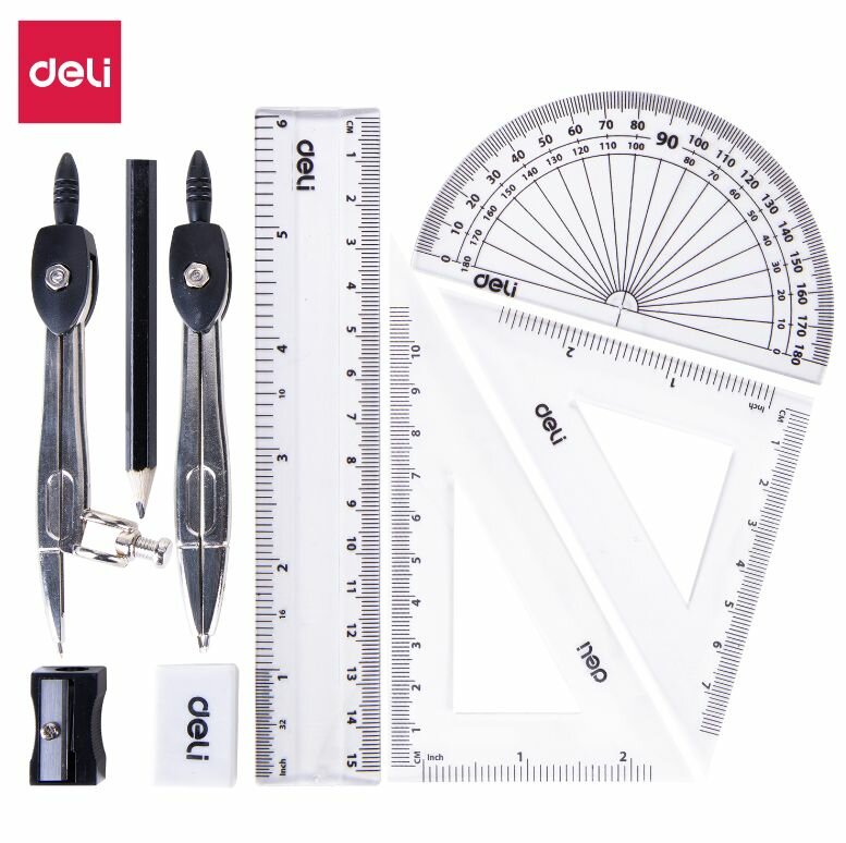 Купить Набор из 12 штук Набор для черчения Deli EG30695 в комплекте: циркуль/карандаш/кронциркуль/линейка 15см/2 треугольника/транспортир/ластик/точилка