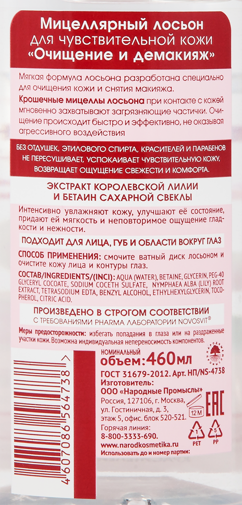 Новосвит Мицеллярная вода-лосьон для лица для чувствительной кожи с экстрактом королевской лилии очищение глубокое увлажнение без отдушек 460мл /
