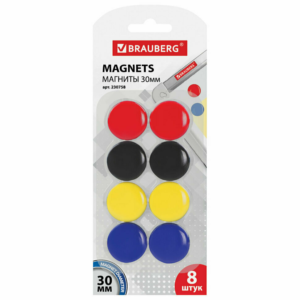Магниты диаметром 30 мм, комплект 8 штук, цвет ассорти, в блистере, BRAUBERG, 230758 Комплект : 1 шт .