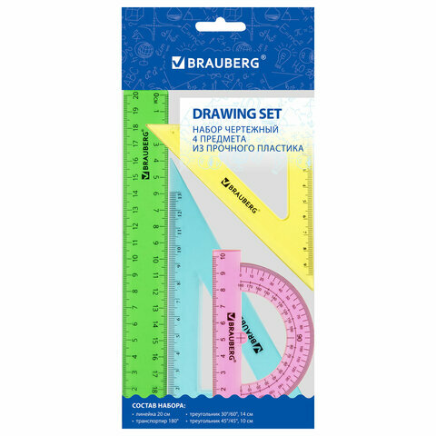 Набор чертежный средний BRAUBERG "Crystal" (линейка 20 см, 2 угольника, транспортир), цветной, 210296 Комплект - 12 шт.
