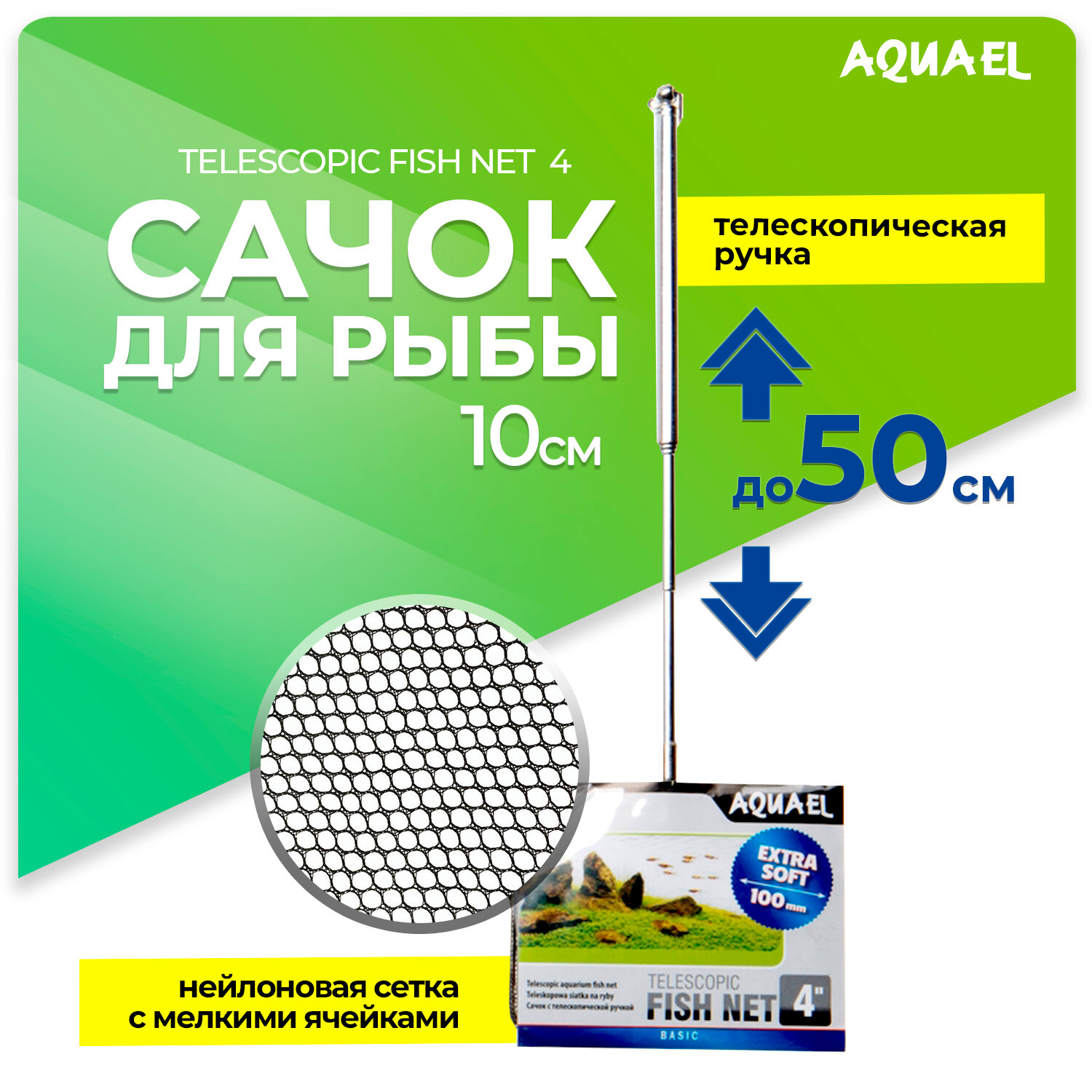 Сачок для рыбы AQUAEL TELESCOPIC FISH NET 4" / 100х75 мм, с телескопической ручкой