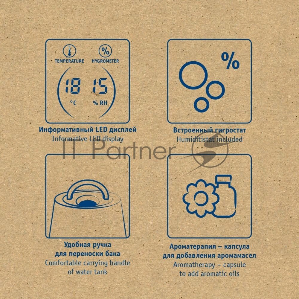 | Отзыв: | Теперь, когда зимой в гостиной приходится включать тепловентилятор, воздух не становится сухим. Резервуар большой, воды хватает на целый день. Если нет воды, то не включится. |