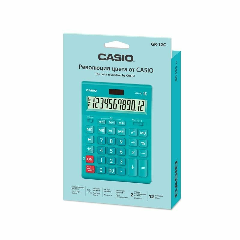 Калькулятор настольный CASIO GR-12С-GN (210х155 мм), 12 разрядов, двойное питание, салатовый, GR-12C-GN-W-EP В комплекте: 1шт.