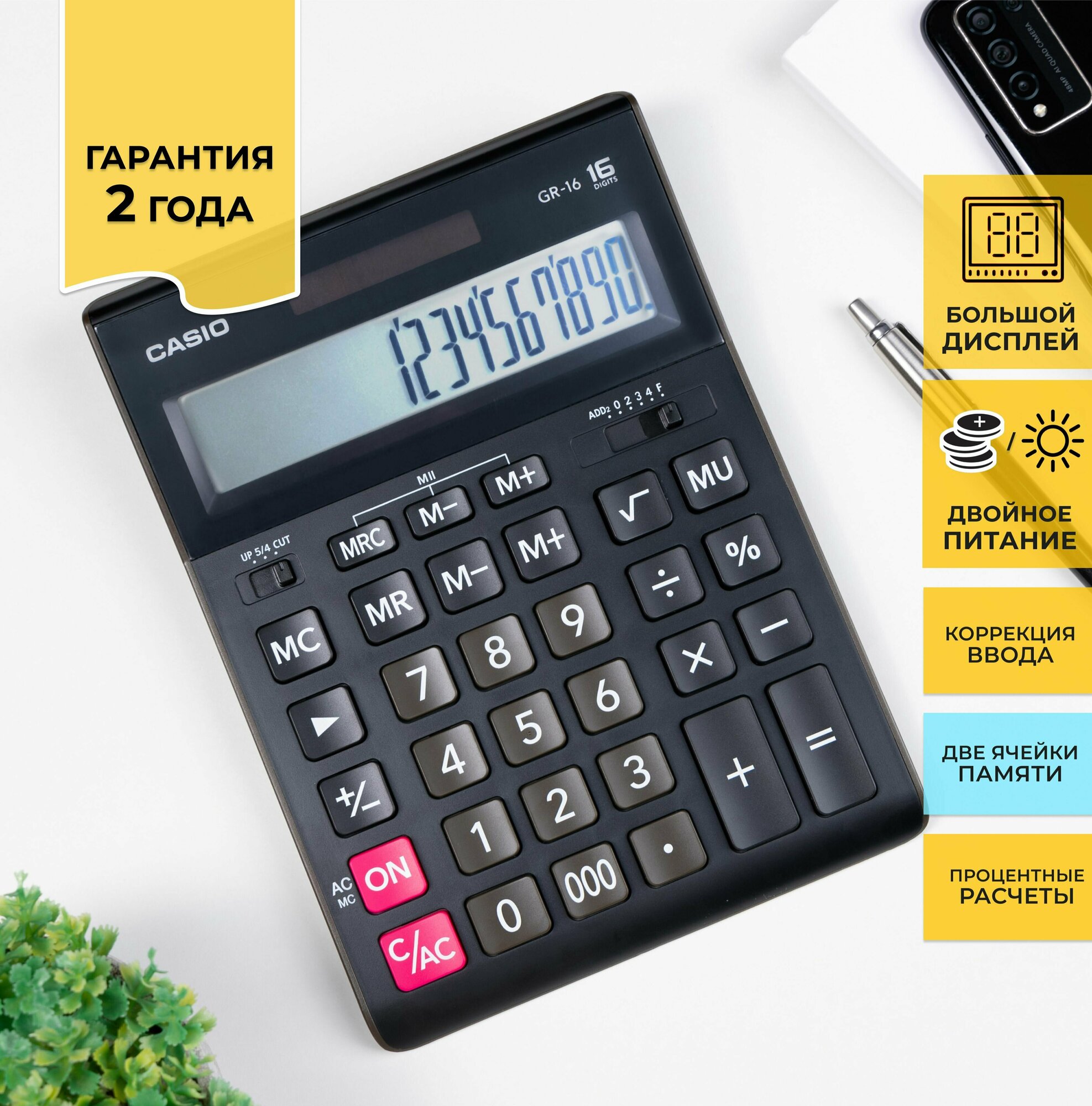 Калькулятор Casio настольный, 16 разрядов, двойное питание, 209х155 мм, черный (GR-16-W-EP)