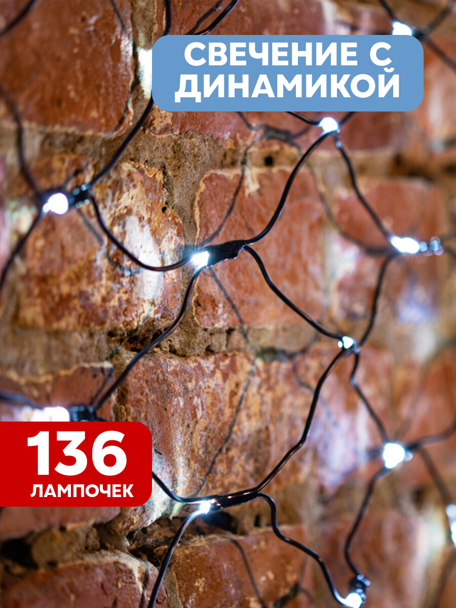 Гирлянда "Сеть" 2х2х1.5м, свечение с динамикой, черный ПВХ, 136 LED, 230 В, цвет: Белый