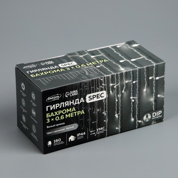 Гирлянда «Бахрома» 3 × 0.6 м, IP44, УМС, белая нить, 160 LED, свечение белое, 220 В