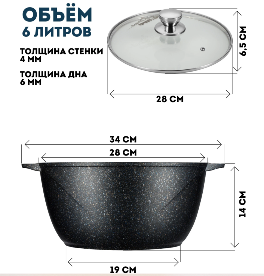 Кастрюля Мечта Гранит Black литая с антипригарным покрытием, со стеклянной крышкой, 6л, гранит black