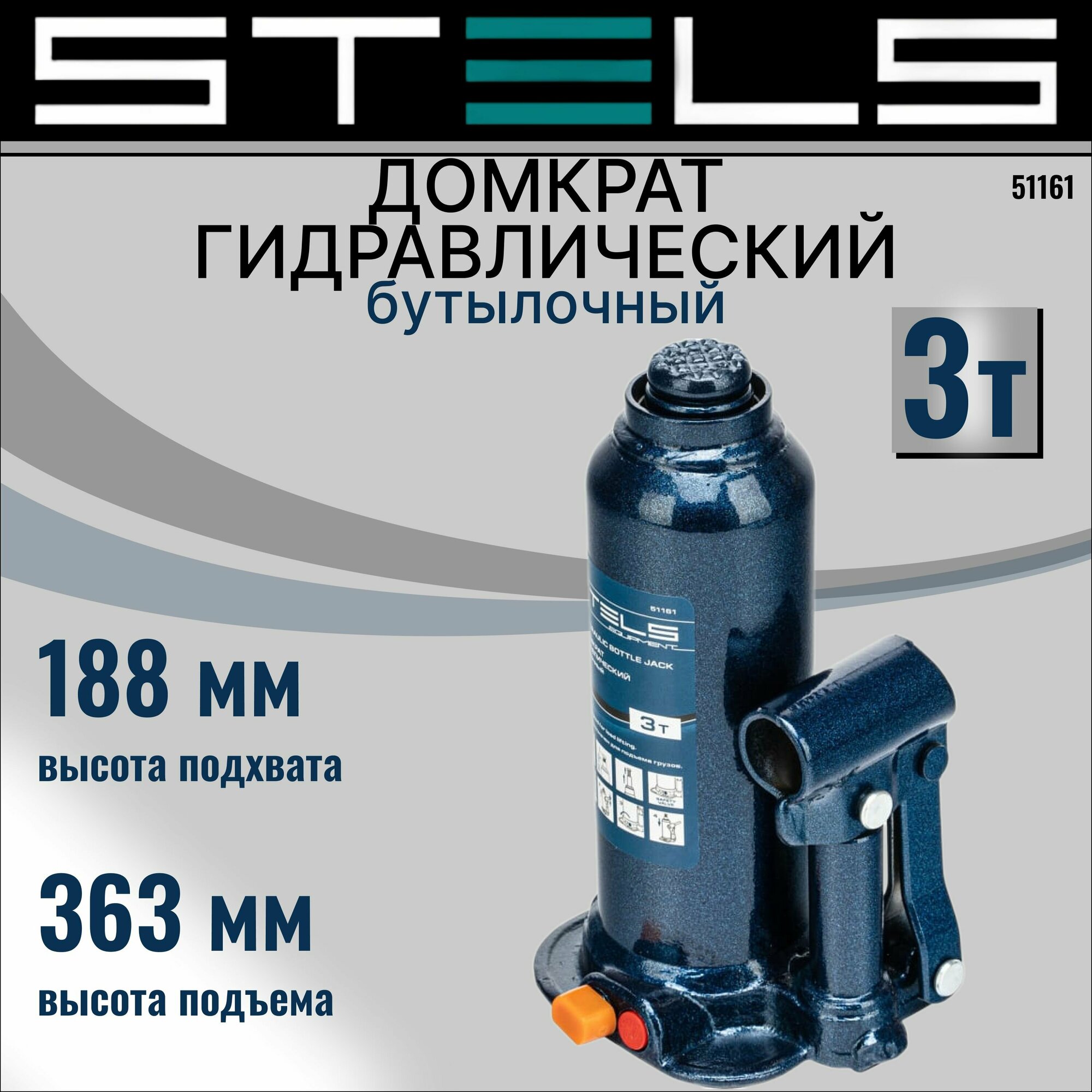 Домкрат гидравлический бутылочный, 3 т, h подъема 188-363 мм Stels, арт. 51161