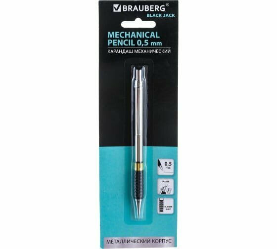 Карандаш механический BRAUBERG "Black Jack", металлический корпус, резиновый грип, ластик, 0,5 мм, 180463