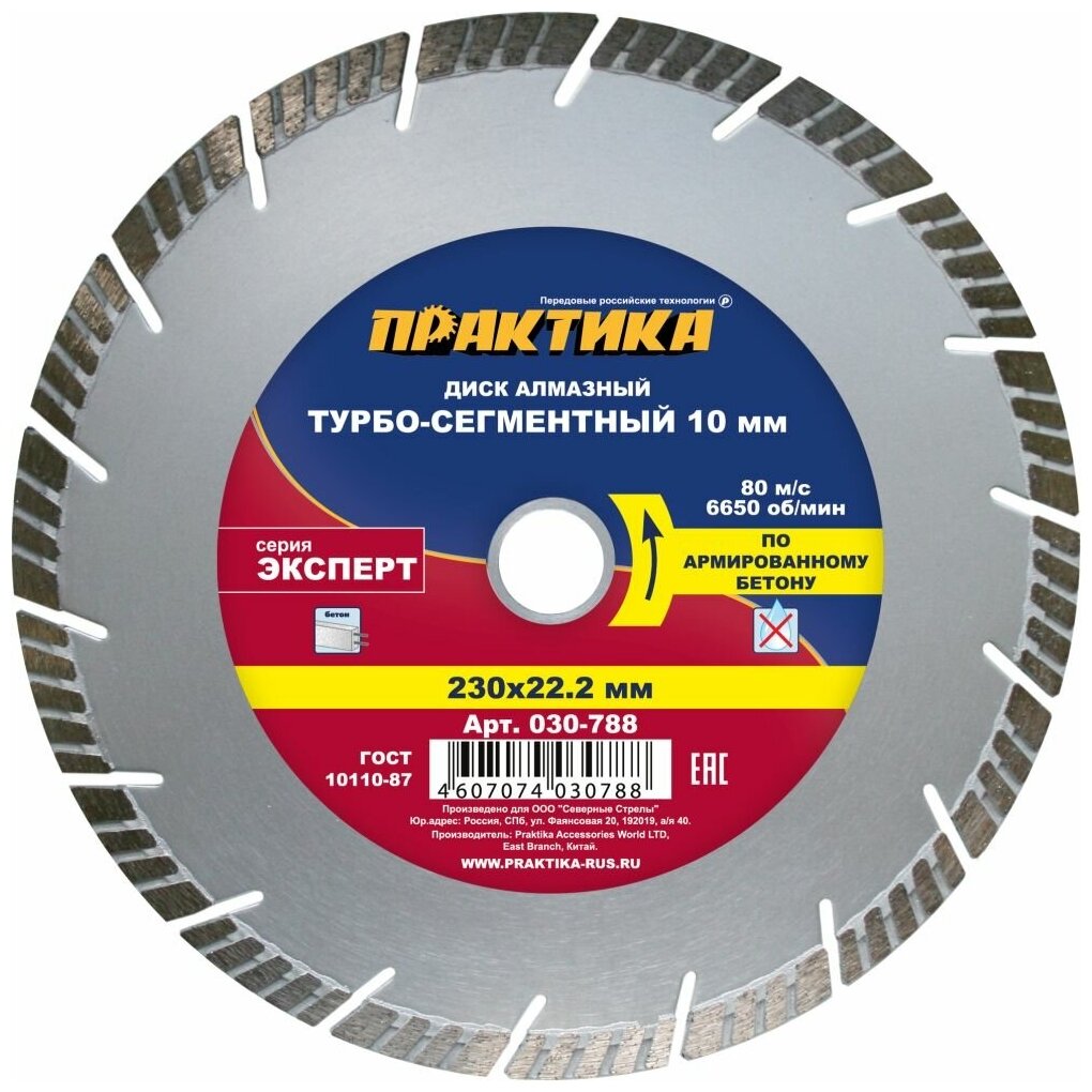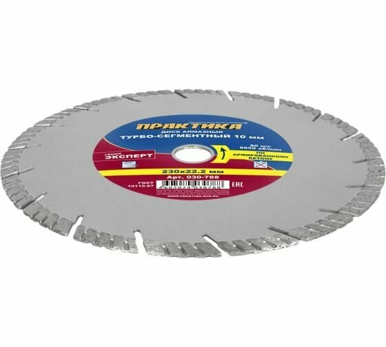 Диск алмазный турбосегментный ПРАКТИКА "Эксперт-бетон" 230 х 22 мм, сегмент 10мм (1 шт.) к (030-788)