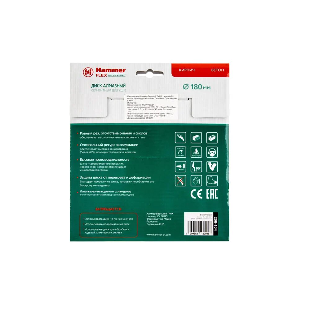 Купить Круг алмазный HAMMER Ф180х22мм универсальный (206-104 DB SG)