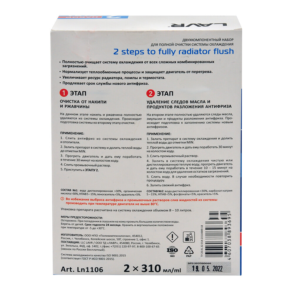 Промывка системы охлаждения Lavr 2 Steps To Fully Radiator Flush, в 2 этапа, от накипи, ржавчины, масла и продуктов разложения антифриза, бутылка 310+310мл, арт. Ln1106